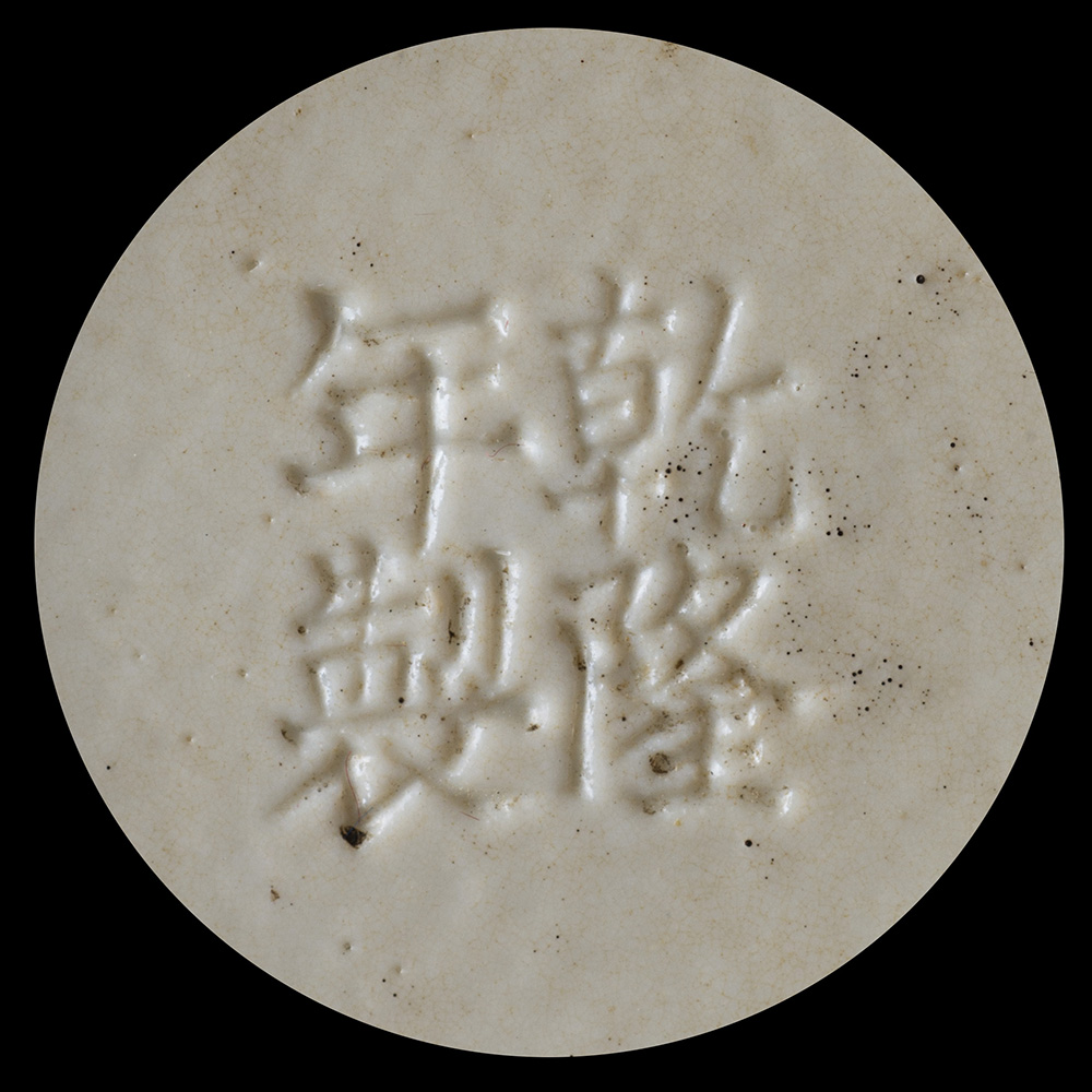 Piccola scatola in porcellana a pasta tenera, con raffinata decorazione a rilievo di drago dai cinque artigli tra le onde, marchio apocrifo Qianlong alla base Cina, sec. XIX A small soft-paste porcelain circular box and cover, finely decorated in high relief with a five-clawed dragon amongst waves, with apocryphal Qianlong mark to the base China, 19th century (diam. 6,5 cm.)