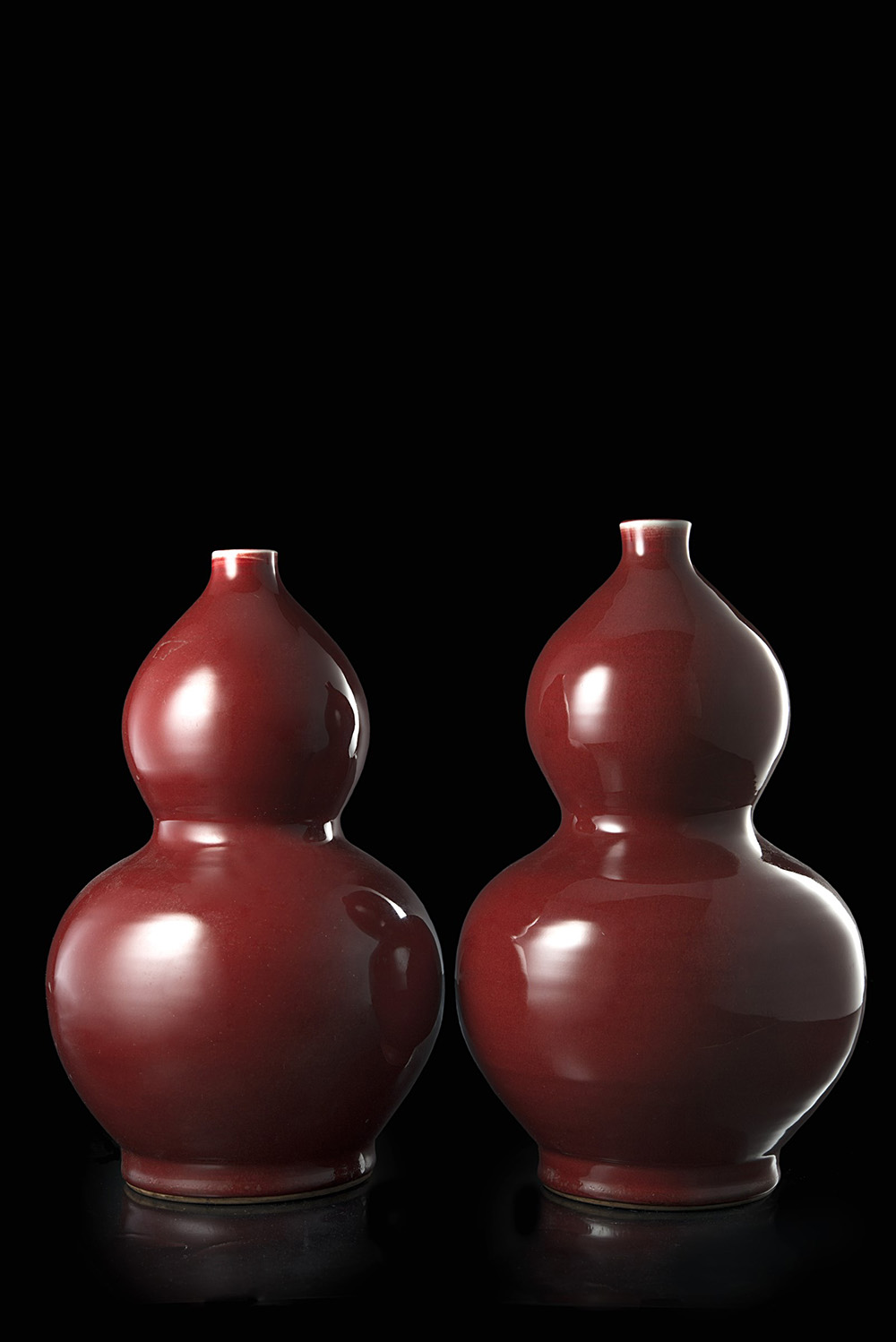 Due vasi in porcellana a forma di doppia zucca con invetratura sangue di bue Cina, sec. XX Two double gourd porcelain vases with sang-de-beouf glaze China, 20th century (h. 30-32 cm.)