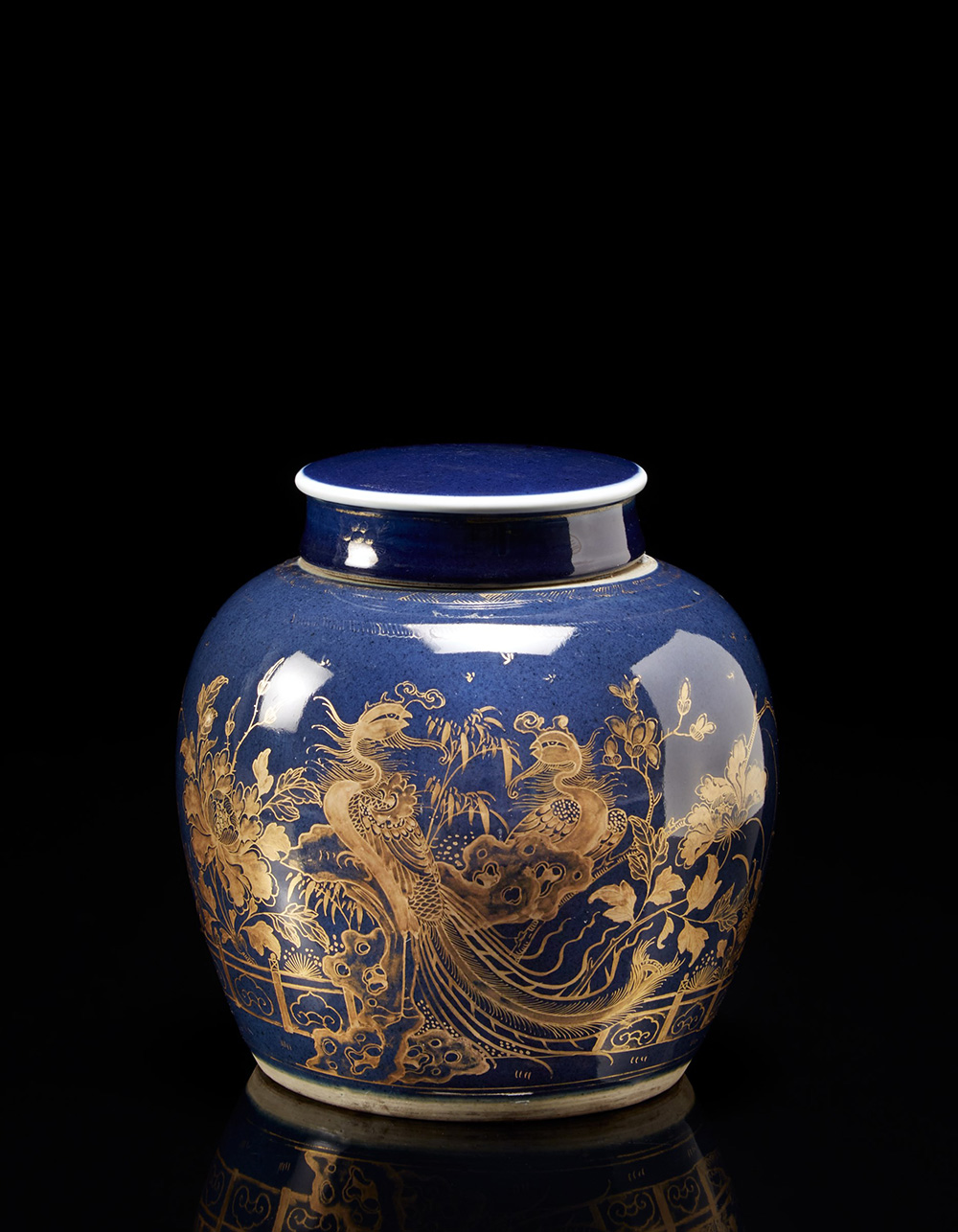 Ginger jar con coperchio con decorazione di fenici tra rami in fiore su fondo blu polvere Cina, sec. XIX A ginger jar and cover decorated with a phoenix on a blue ground China, 19th century (h. 22 cm.)