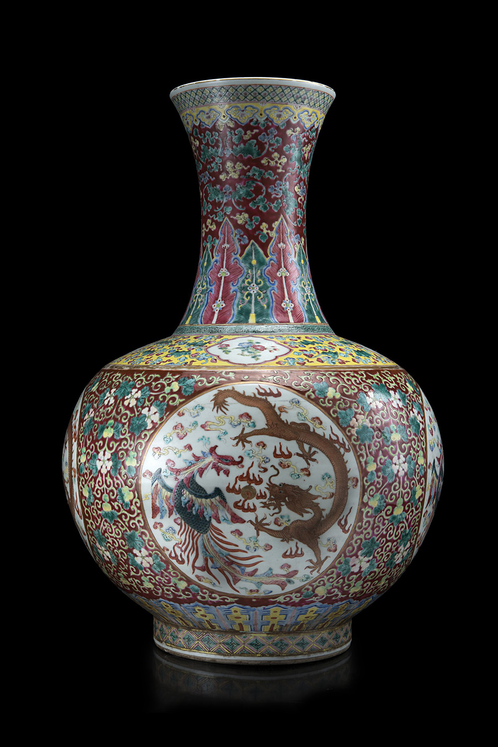 Grande vaso a bottiglia in smalti Famiglia Rosa su fondo color rubino, decorato con draghi e fenici e motivi floreali sul collo (restauri) Cina, periodo Guangxu (1875-1908) A large ruby-ground Famille Rose bottle vase decorated with phoenix and dragons, the neck with floral motifs (restorations) China, Guangxu period (1875-1908) (h. 56 cm.)
