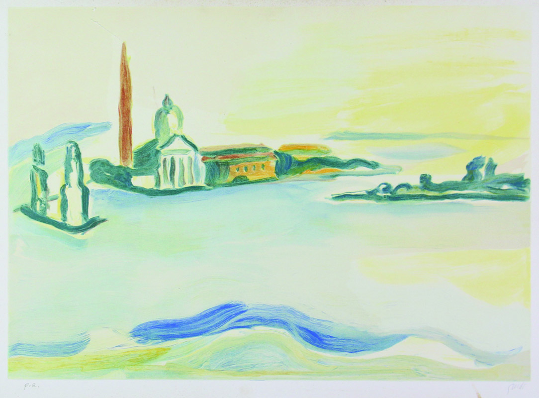 Virgilio Guidi, Venezia, 1982, litografia su carta, cm. 45x45, es. prova d'autore, firmata in basso a destra, l'opera presenta un graffio in alto a sinistra e macchie di umidità ai margini, certificato di autenticità della Galleria d'Arte Portobello Road di Genova, senza cornice