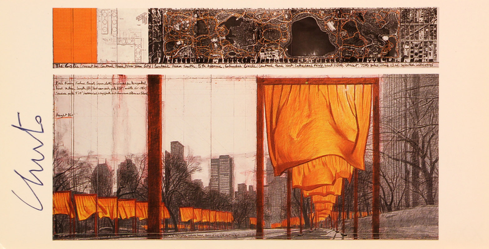 Christo, The Gates / Project for Central Park New York, 2004, stampa su cartolina, cm. 12x23, firmata a sinistra, senza cornice