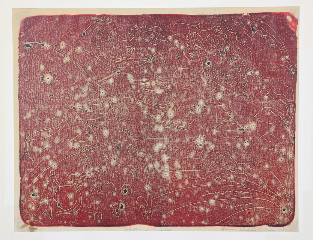 Anonimo, Battaglia degli Angeli, 1969, litografia su carta, cm. 40x50, firma non decifrata e data in basso a destra, intitolato in basso al centro, l'opera presenta una macchia di umidità allo spigolo in basso a sinistra o segni di scotch ai quattro angoli