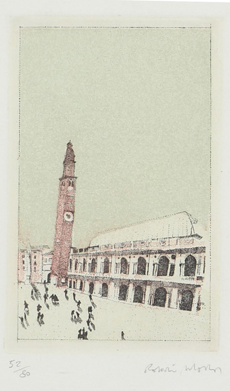 Ignoto, Piazza dei Signori, incisione su carta, cm. 19x24 (lastra cm. 12x8), es. 52/80, firma non decifrata in basso a destra