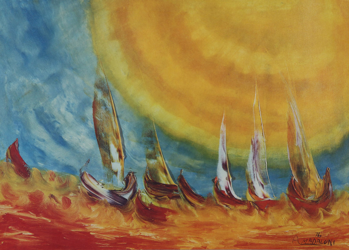 Alfonso Madaluni, Barche, 1974, olio su carta, cm. 27x38, firmato e datato in basso a destra