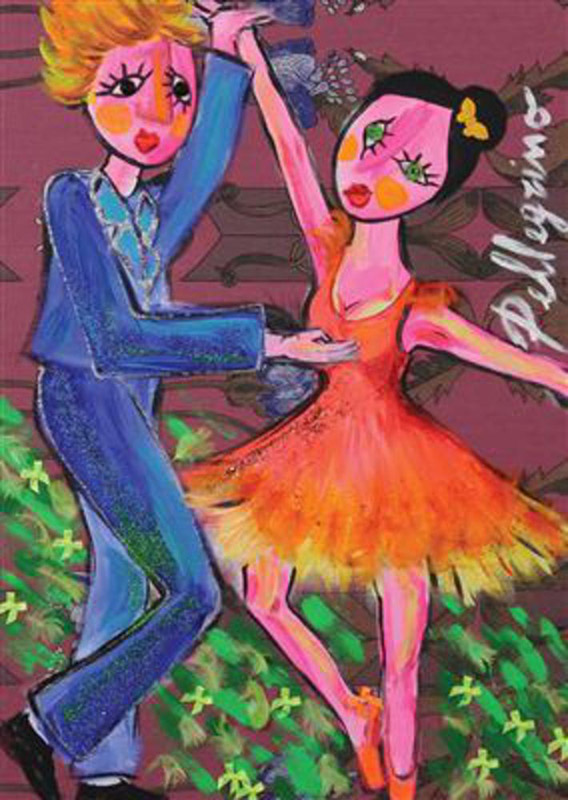 Federica Pellegrino, Passo a due, tecnica mista e materiali vari su broccato applicato su tavola, cm. 70x50, firmato in alto a destra, firmato ed intitolato al retro, autentica dell'artista su foto