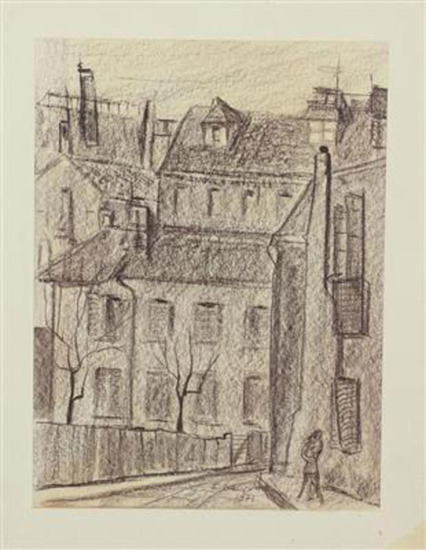 Franco Dacquati, Scorcio di Città, 1973, carboncino su carta, cm. 40x30, firmato e datato in basso al centro