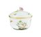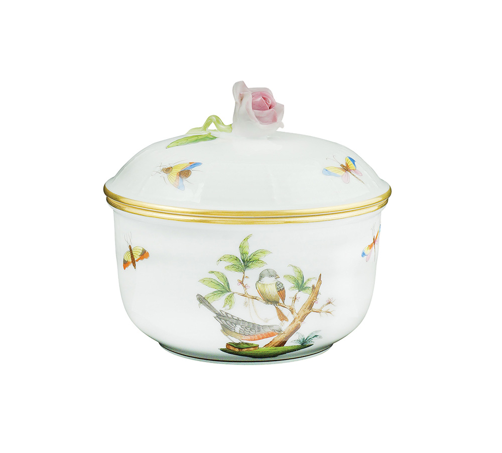 Herend, zuccheriera in porcellana XX Sec. 9x11 cm. decoro "Rothschild", forma circolare con presa a foggia di rosa, marchio sotto la base