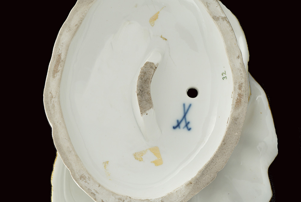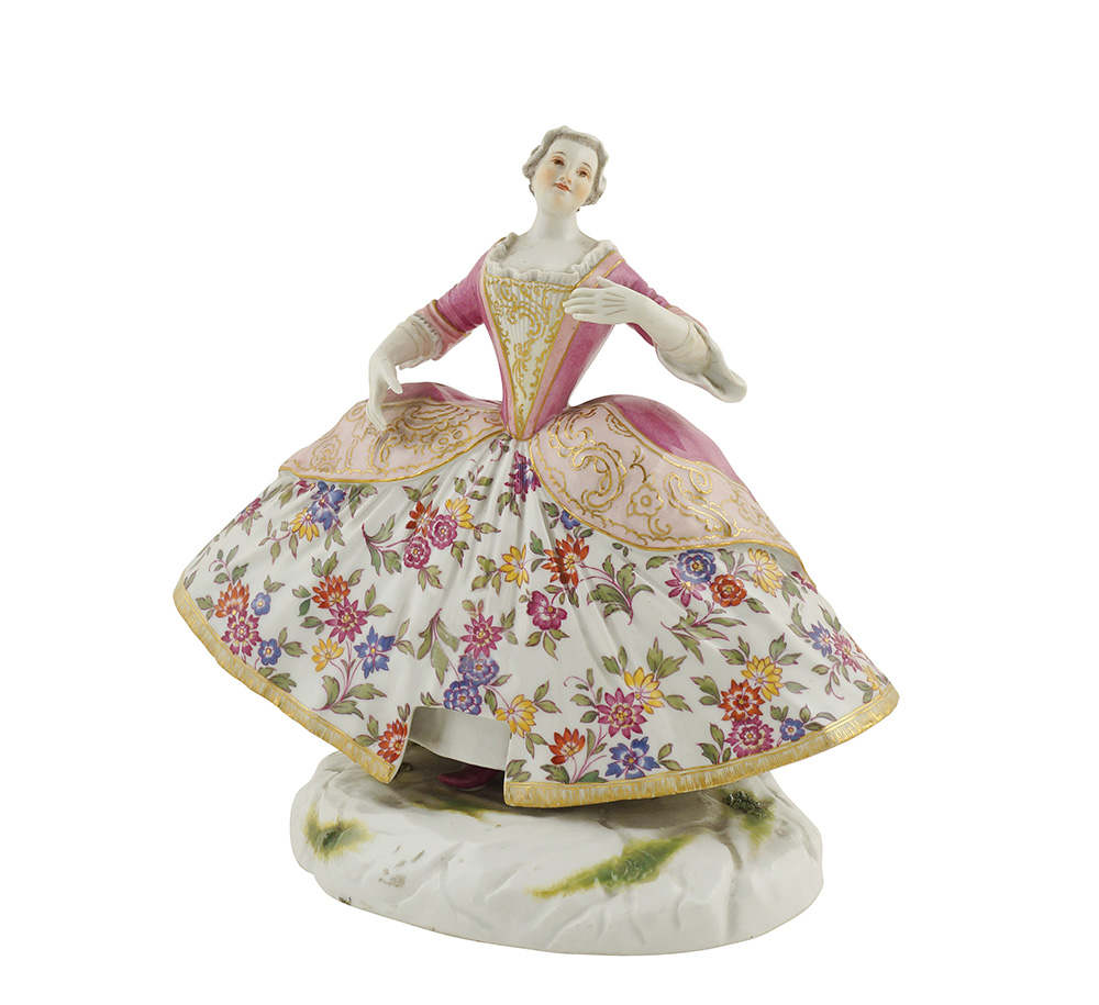 Figura in porcellana Meissen seconda metà XIX Sec. h. 21,5 cm. dipinta in policromia e raffigurante la dama detta "del Mopsorden", poggiante su base ovale a simulare la roccia, marchio sotto la base, lievi difetti