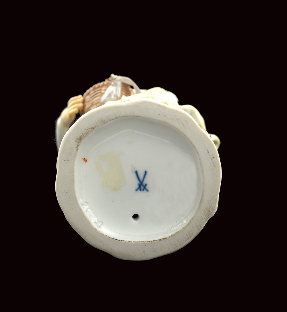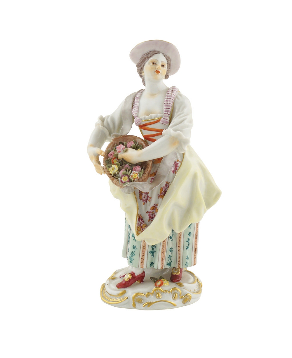 Figura in porcellana Meissen fine XIX Sec. h. 16,5 cm. dipinta in policromia e raffigurante una giovane fioraia, marchio sotto la base, lievi difetti