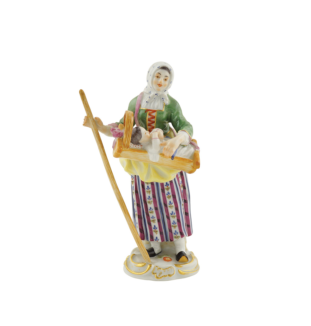 Figura in porcellana Meissen fine XIX - XX Sec. h. 14,5 cm. dipinta in policromia e raffigurante una giovane donna con neonato in culla, base a roccailles, marchio sotto la base