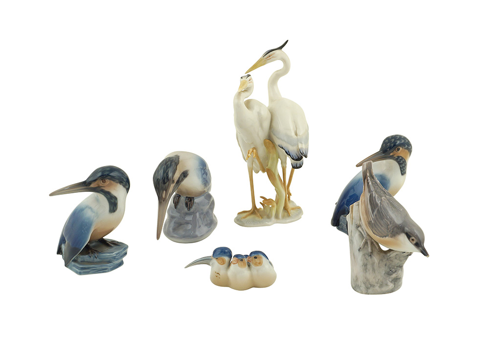Sei animali in porcellana dipinti in policromia XX Sec. h. 20 - 4 cm. manifatture Royal Copenaghen e Bind & Grondahl, marchio sotto le basi