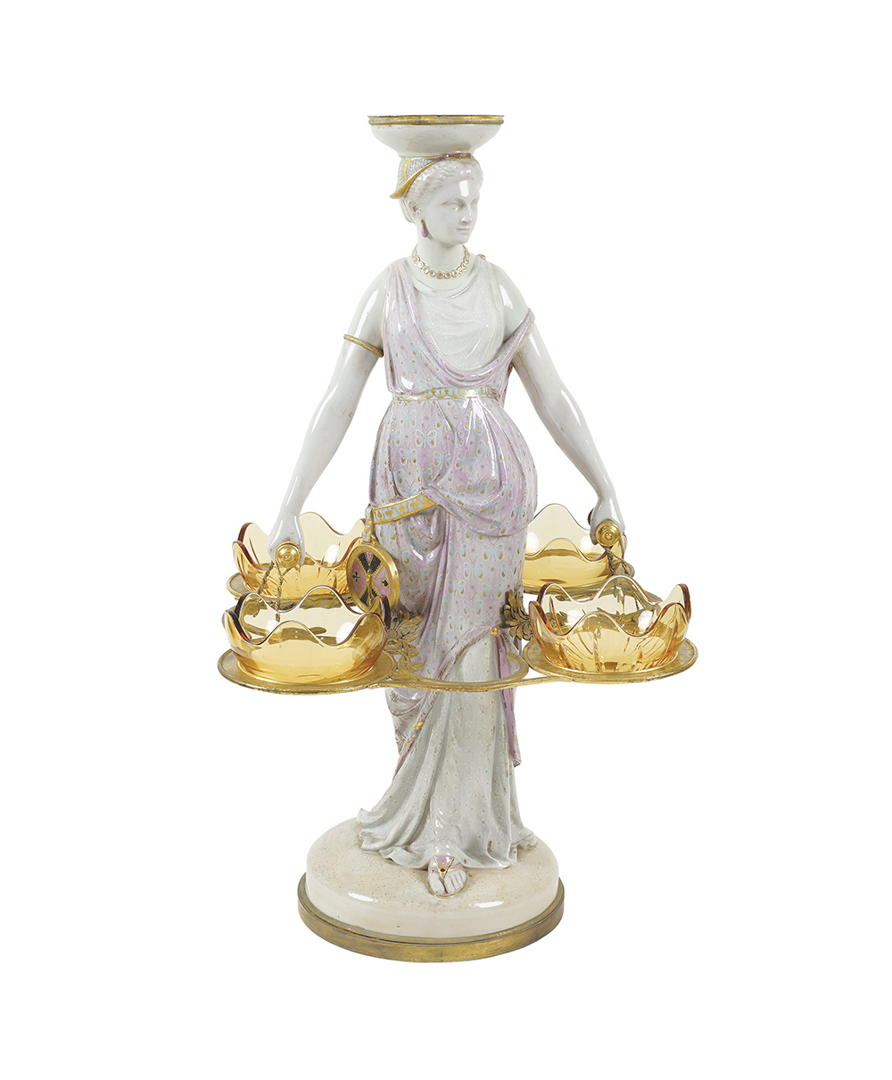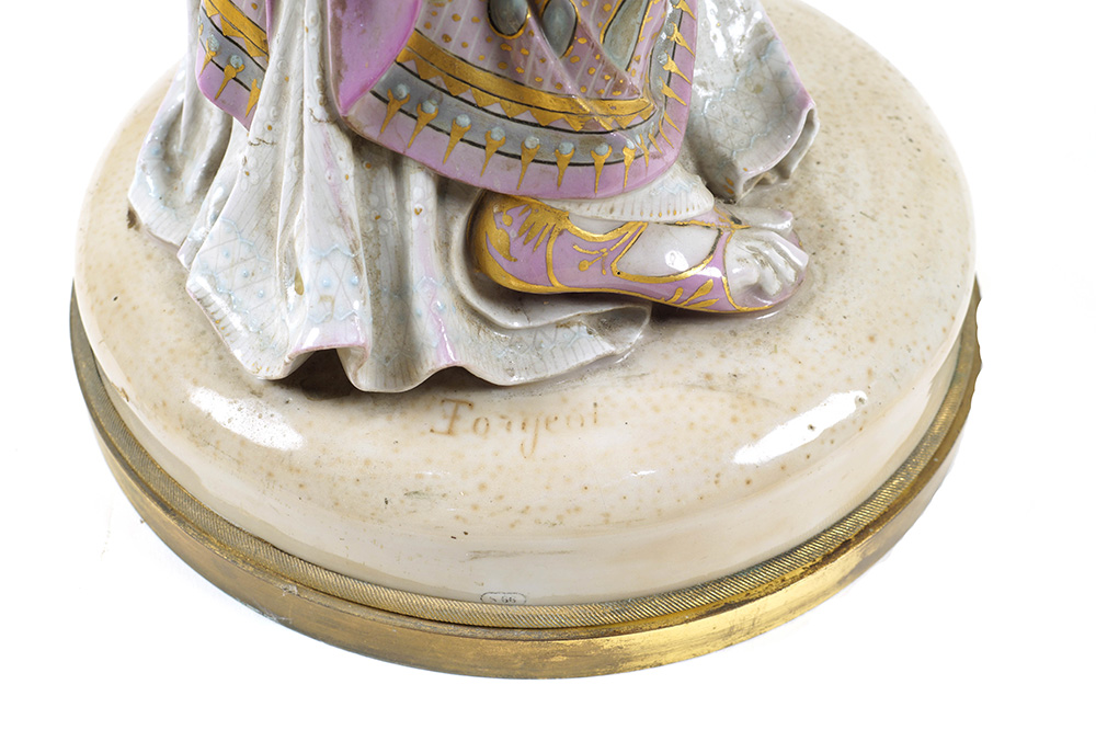 Particolare centrotavola in ceramica e metallo dorato Francia, Sevres XIX Sec. 74x41x41 cm. firmato C. E. Forgeot (attivo tra il 1856 - 1888), dipinto in policromia raffigurante una giovane portatrice di acqua, poggiante su base circolare, restauri