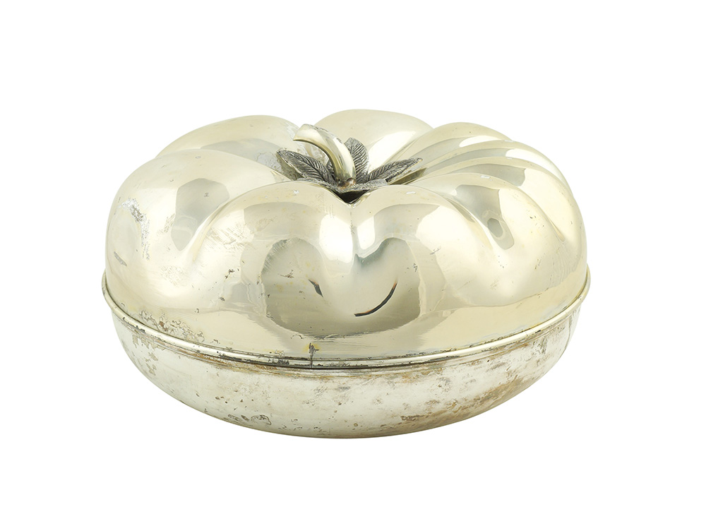 Grande scatola centrotavola in metallo argentato XX Sec. d. 27 cm. a foggia di pomodoro, difetti
