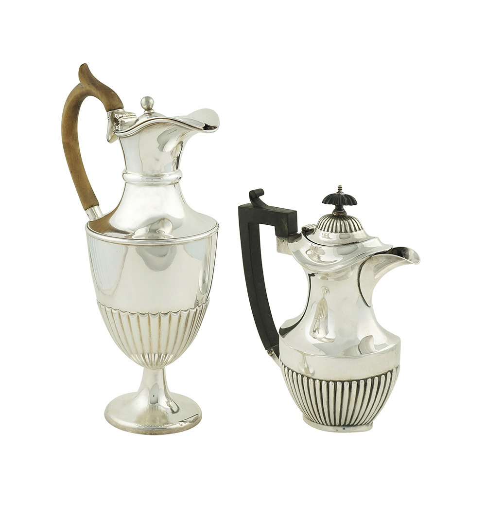 Due caffettiere in sheffiield Inghilterra, inizio XX h. 27 - 19 cm. manici in...