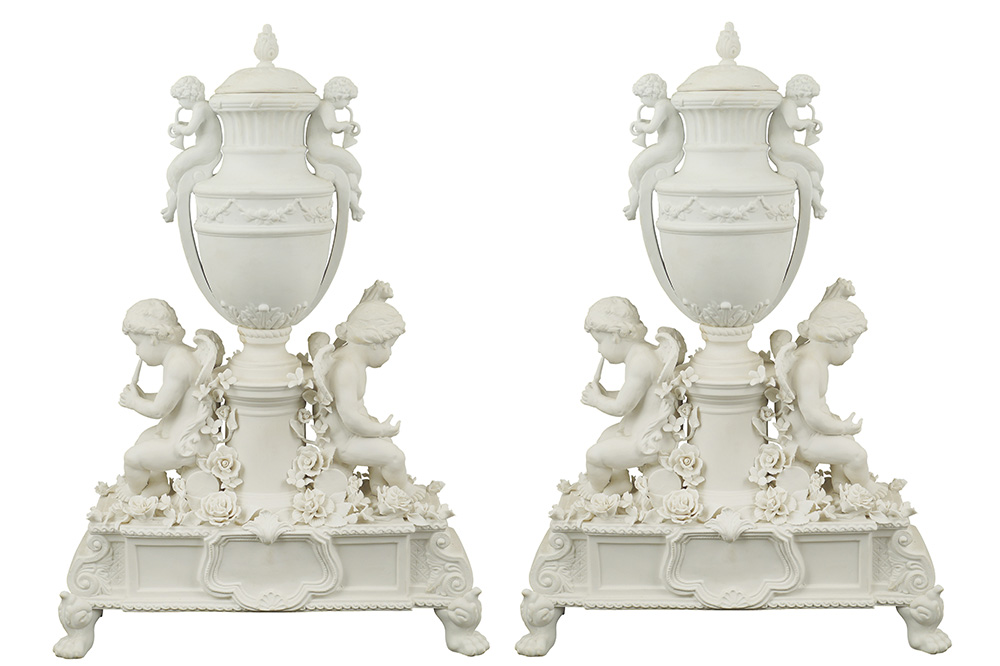 Coppia di gruppi in biscuit XX Sec. 65x46x16 cm. corpo centrale raffigurante una grande anfora con coperchio, ai lati putti suonatori e motivi floreali, base di linea rettangolare con piedi ferini, lievi difetti e mancanze