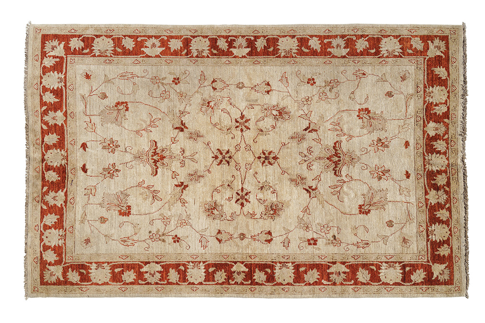 Tappeto Ziegler Pakistan, XX Sec. 268x181 cm. a disegno floreale su fondo beige e rosso, colori vegetali, trama vello e ordito in lana