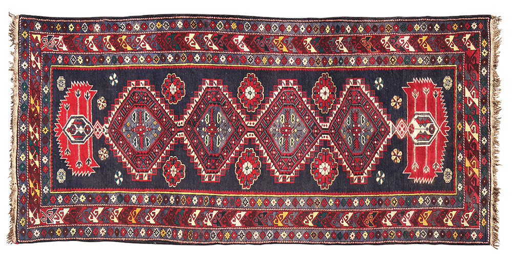 Tappeto orientale vecchia manifattura 273x133 cm. disegno geometrico a colori vegetali, trama vello e ordito in lana