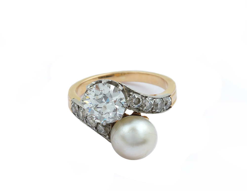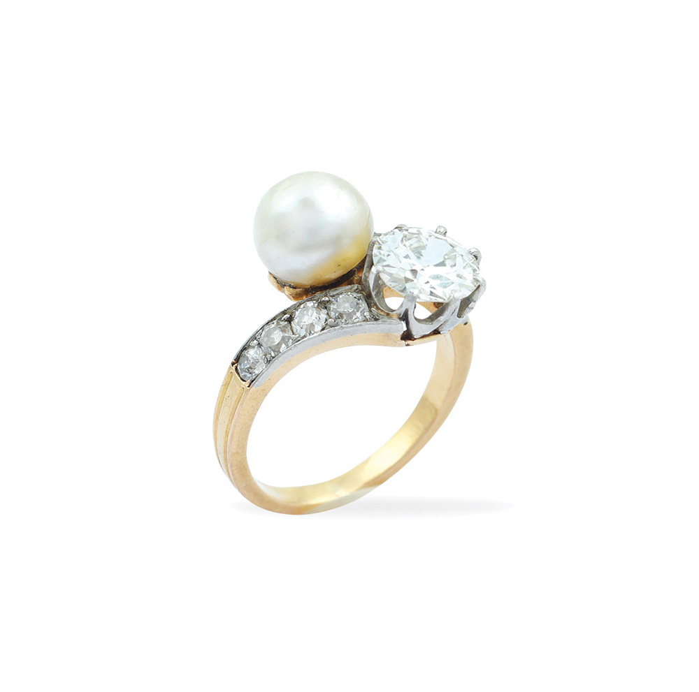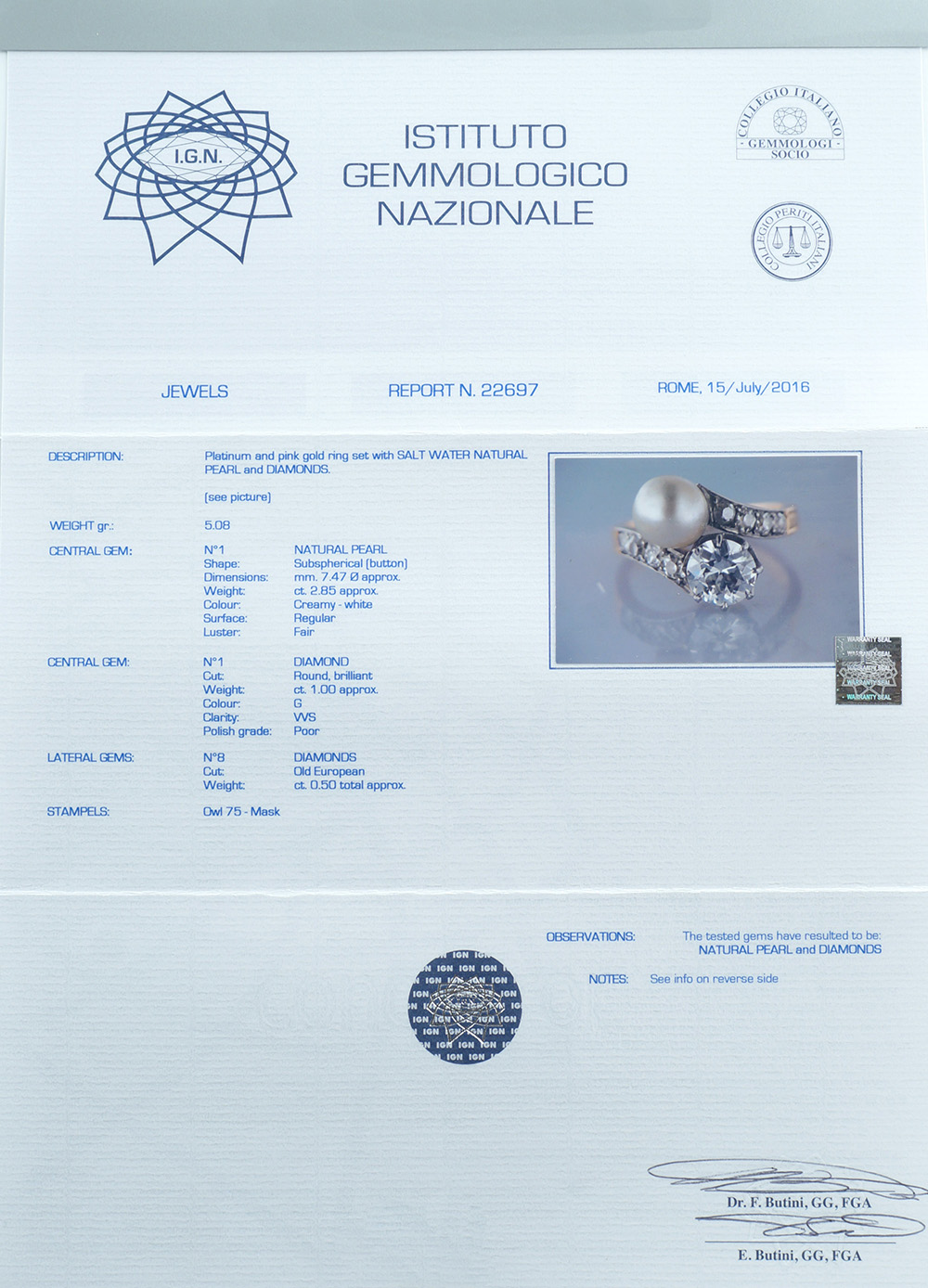 Anello contrariè oro rosa 18kt e platino anni 40/50 peso 5,0 gr. con una perla naturale ct 2,85 circa, mm. 7,47 circa e un diamante taglio brillante ct 1 circa colore G - purezza VVS e altri diamanti taglio brillante ct 0,50 circa. Completo di certificato gemmologico I.G.N. n.22697