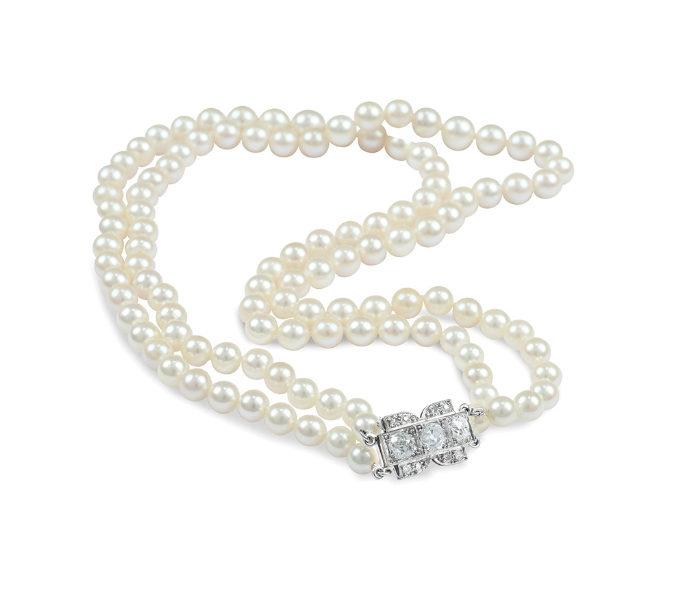 Collana a due fili di perle coltivate anni 40/50 disposte a gradazione da mm. 9 a mm. 6, chiusura in platino e diamanti taglio brillante antico ct 1,70 circa, lunghezza cm. 45