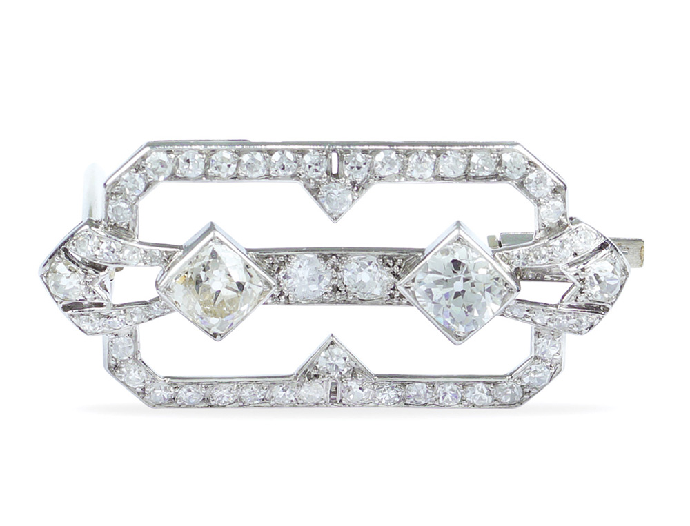 Spilla Decò in platino e diamanti anni 40/50 peso 7,3 gr. di cui due taglio brillante antico ct 1,50 circa e altri diamanti taglio brillante ct 1,20 circa