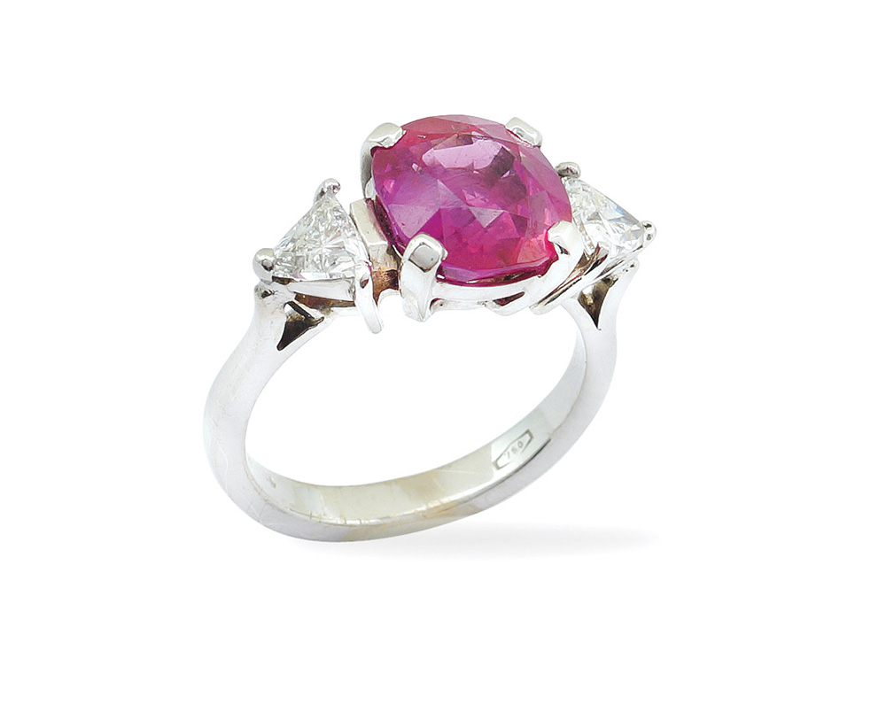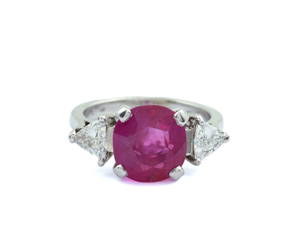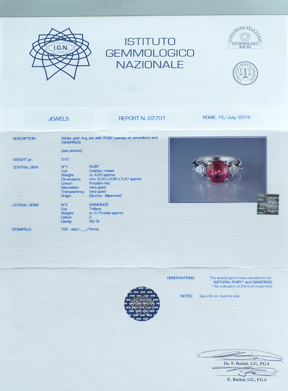Anello in oro bianco 18kt con rubino naturale anni 40/50 peso 5,5 gr. origine Burma - Myanmar, taglio a cuscino ct 4,20 circa, e due diamanti taglio a triangolo ct 0,75 circa colore G - purezza VS/SI, (no trattamento termico), misura 12. Completo di certificato gemmologico I.G.N. n. 22701