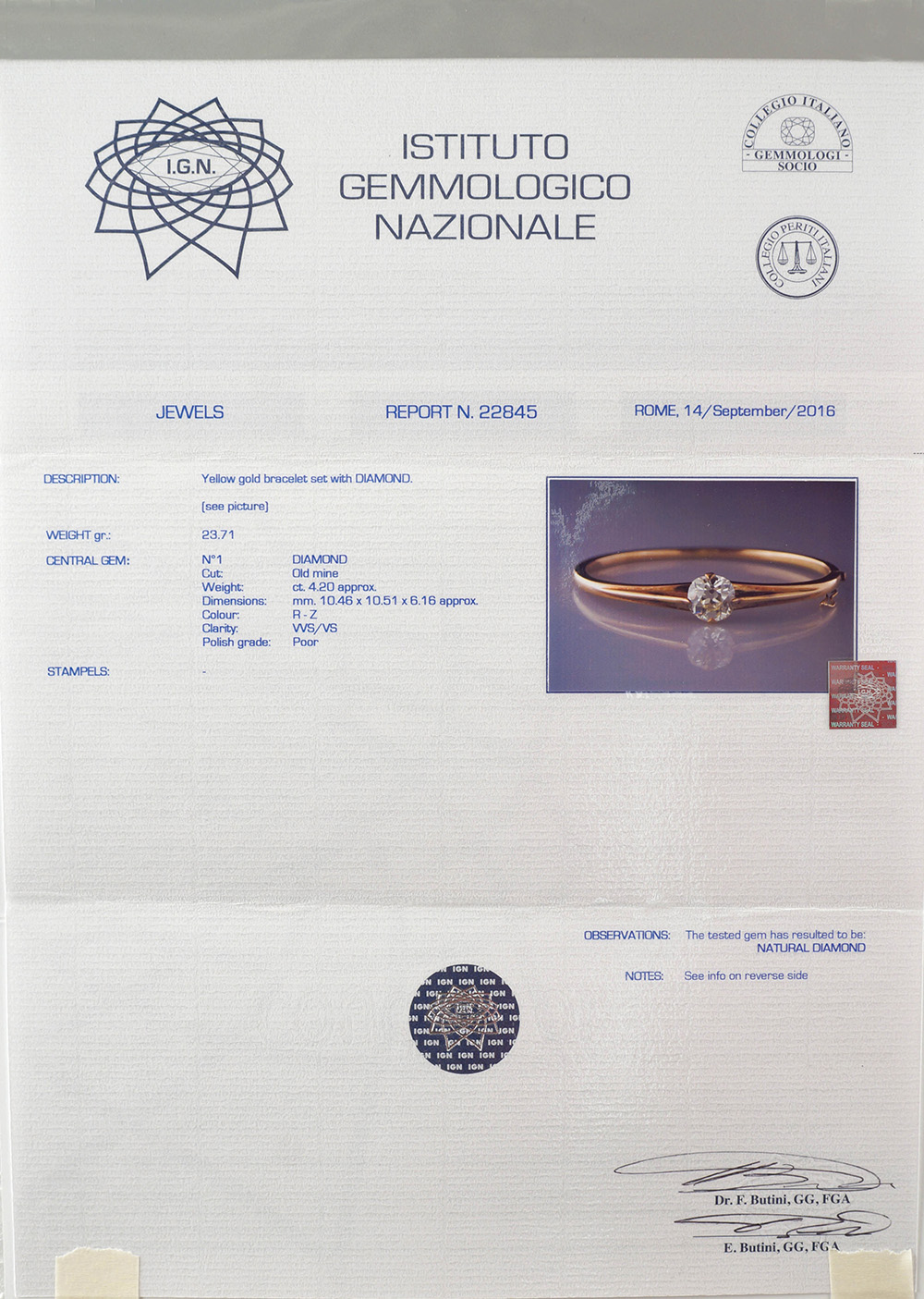 Bracciale manetta in oro rosa con diamante anni 30/40 peso 23,8 gr. taglio brillante vecchio ct 4,20 circa, colore R/Z - purezza VVS/VS