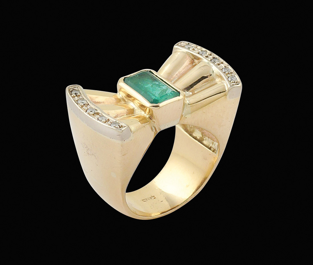Anello a fiocco in oro rosa e bianco 18kt anni 40 peso 18,3 gr. con smeraldo taglio smeraldo ct 2 circa e ai lati diamanti taglio huit-huit, misura 17