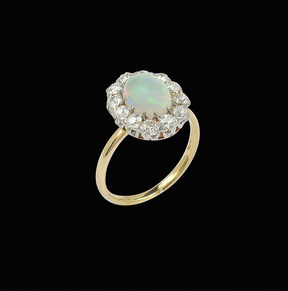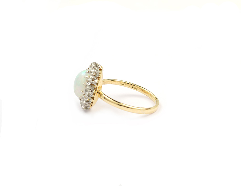 Tiffany & Co. anello in oro giallo e platino firmato, anni 40/50 peso 4,7 gr. con opale arlecchino contornato da diamanti taglio brillante antico ct 1,25 circa, misura 14,5