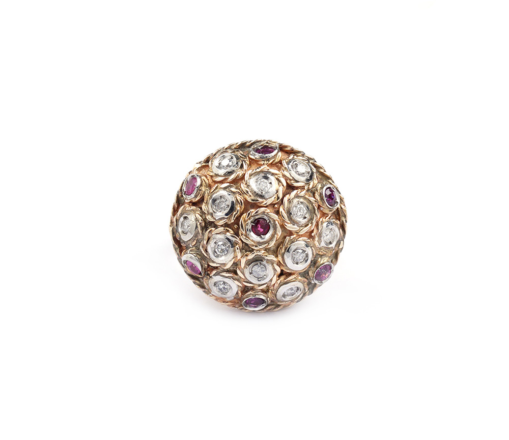 Anello a toppa in oro rosa e bianco 18kt con diamanti anni 40 peso 13,9 gr. taglio brillante antico ct 1 circa e rubini tondi, misura 16