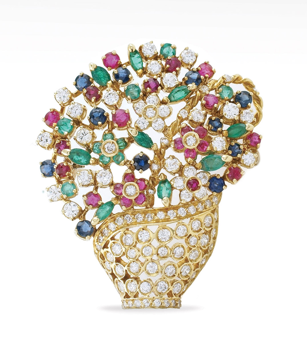 Spilla "cestino fiori" in oro giallo 18kt peso 19,9 gr. con diamanti taglio brillante ct 3 circa alternati a rubini, zaffiri tondi, smeraldi tondi e taglio marquise ct 0,80 ciascuno