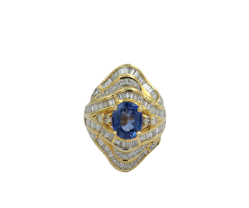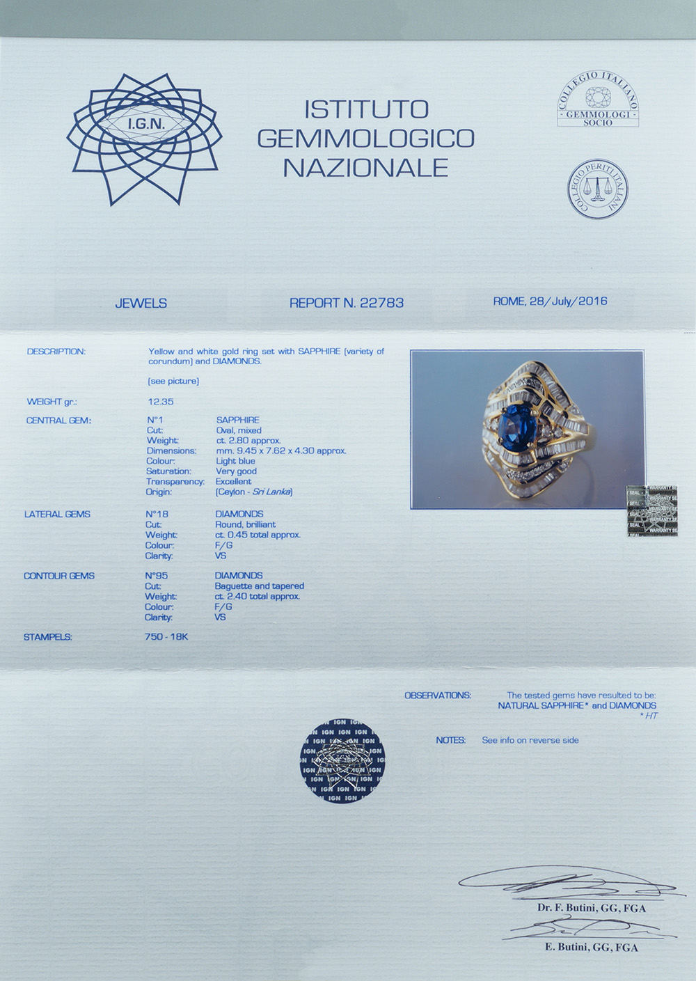 Anello in oro giallo 18kt con zaffiro naturale peso 12,3 gr. origine Ceylon - Sri Lanka, taglio briolet ct 2,80 circa e diamanti taglio tappered e brillante ct 2,85 circa colore F/G - purezza VS, misura 15. Completo di certificato gemmologico I.G.N n. 22783