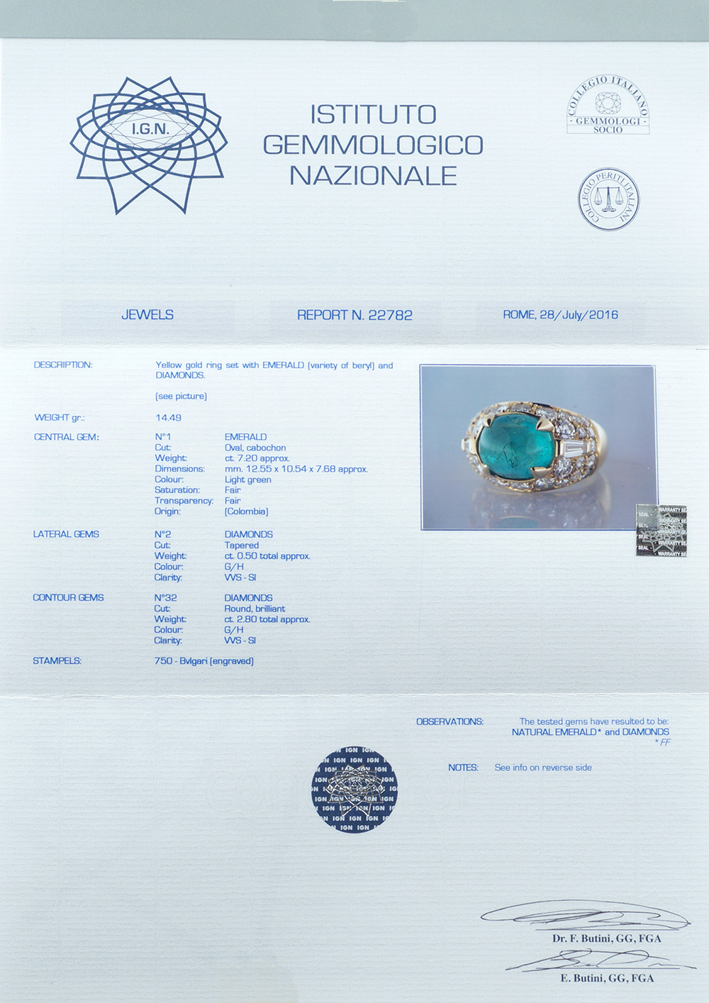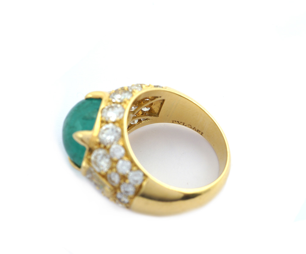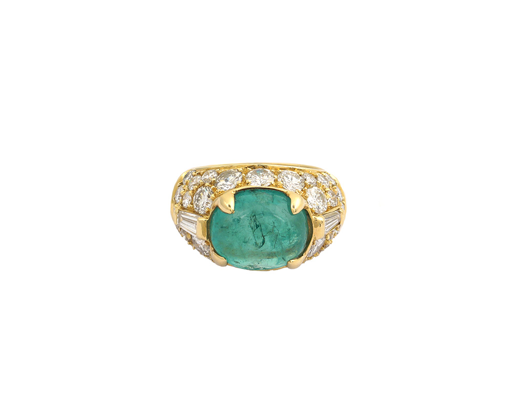 origine Colombia, taglio cabochon ct 7,20 circa, contornato da diamanti taglio brillante e tapered ct 3,30 circa, colore G/H - purezza VVS/SI, misura 15,5. Completo di certificato gemmologico I.G.N n. 22782