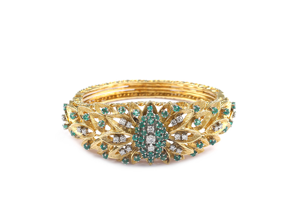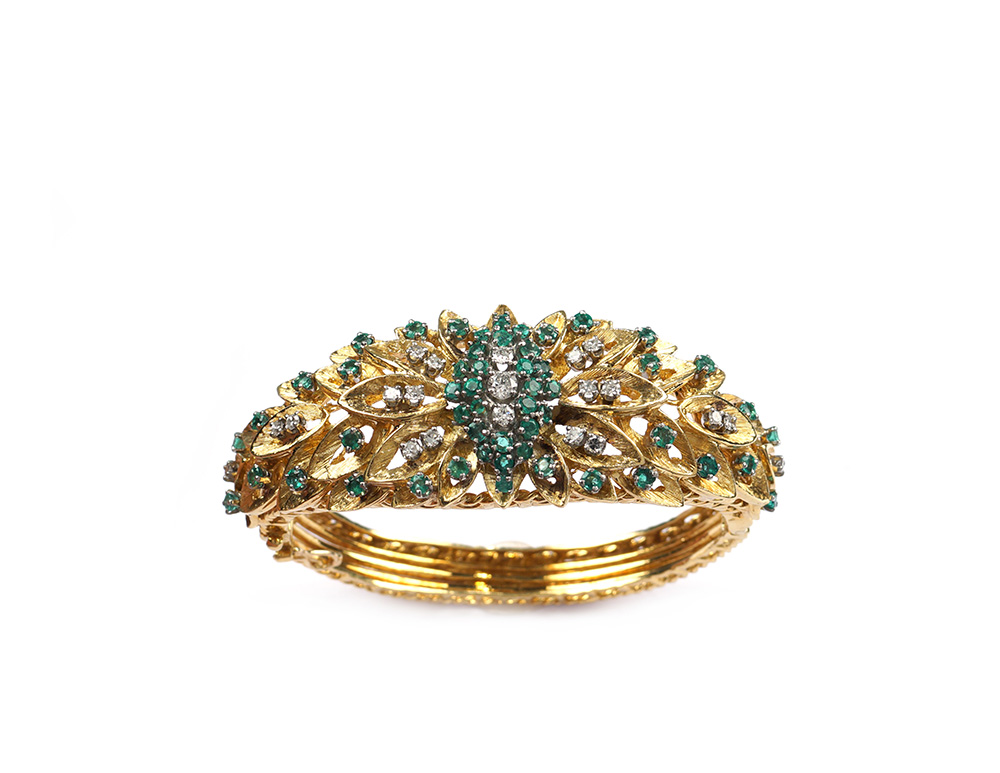 Bracciale a manetta in oro giallo 18kt anni 50/60 peso 58,3 gr. a motivo floreale con diamanti taglio brillante ct 0,80 circa e smeraldi tondi ct 1,30 circa, diametro cm. 6