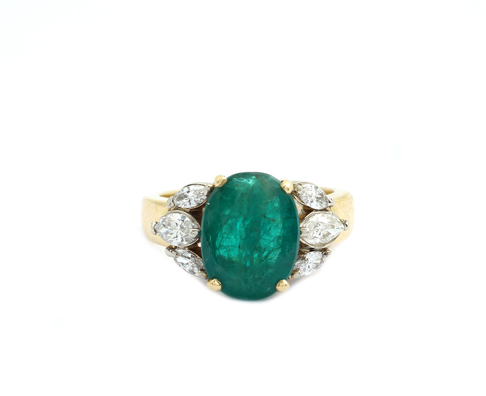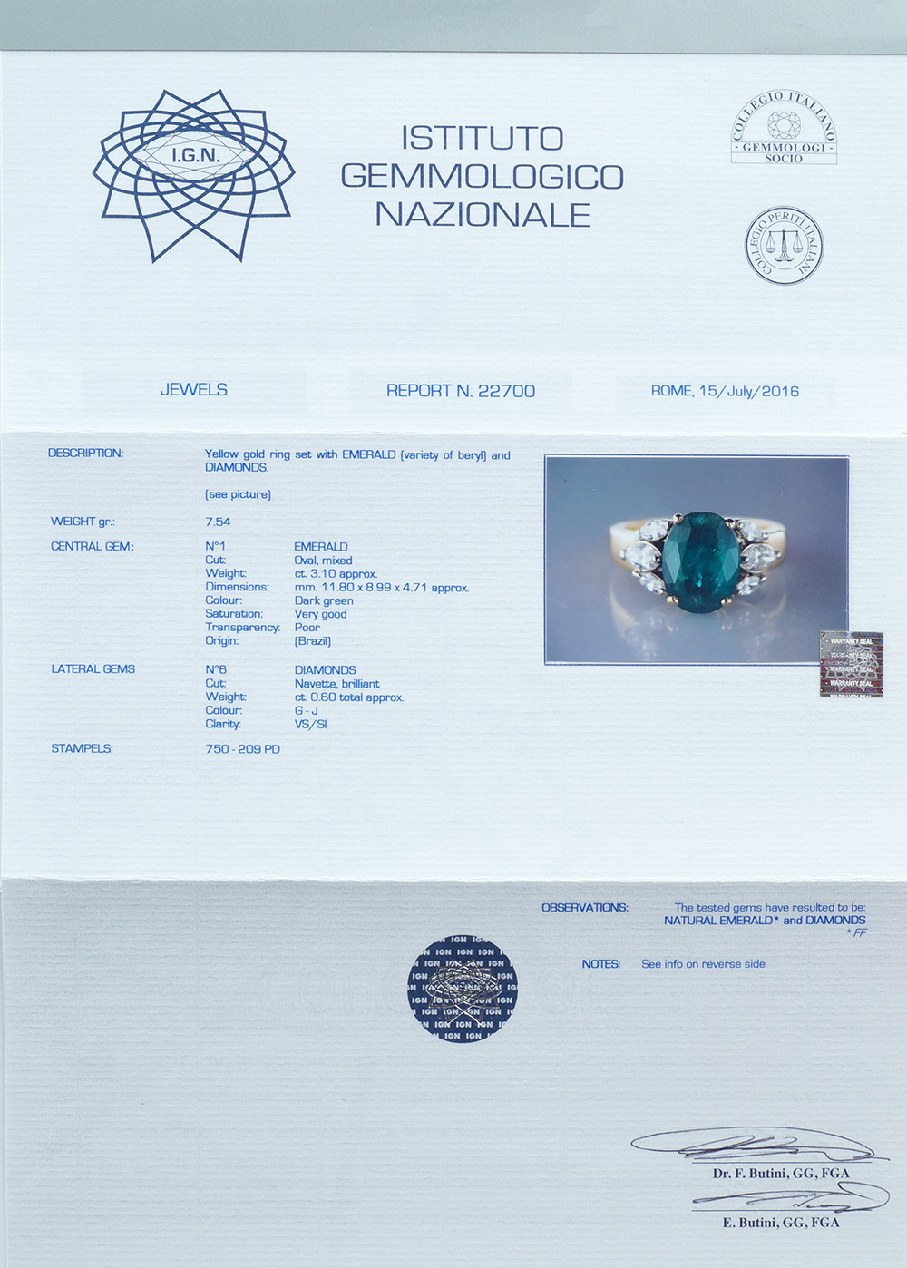 Anello in oro giallo e bianco 18kt con smeraldo naturale peso 7,6 gr. origine Brasile, taglio ovale ct 3,10 circa e diamanti taglio navette e brillante ct 0,60 circa colore G/J - purezza VS/S1, misura 14. Completo di certificato gemmologico I.G.N. n. 22700