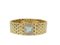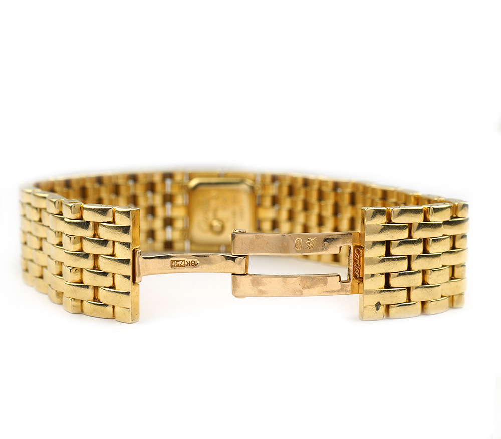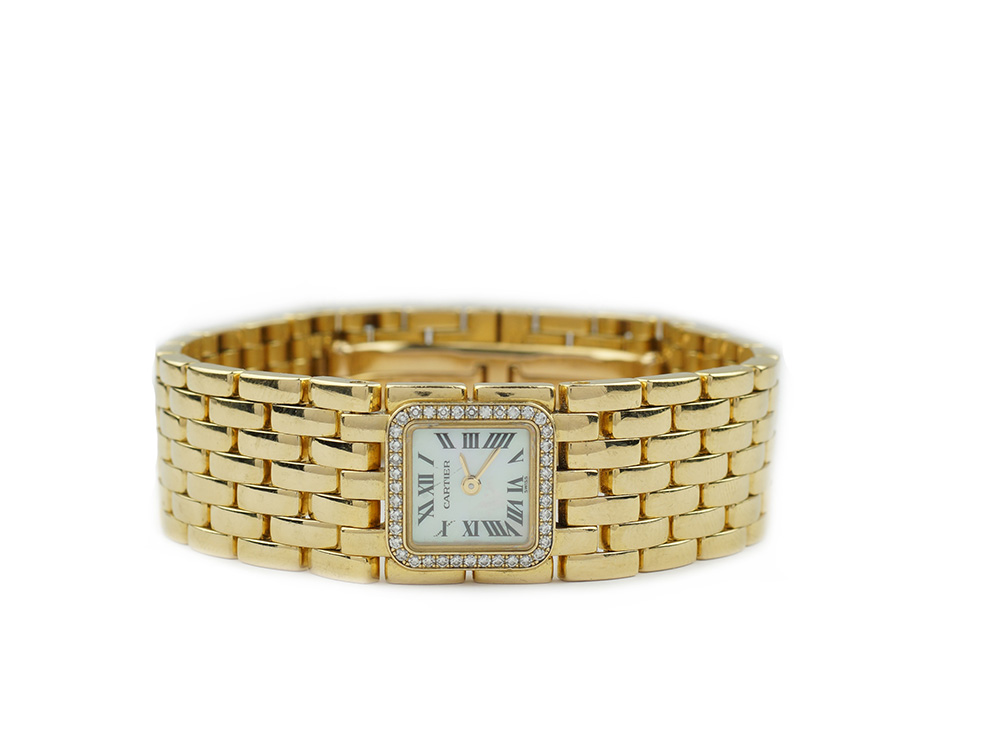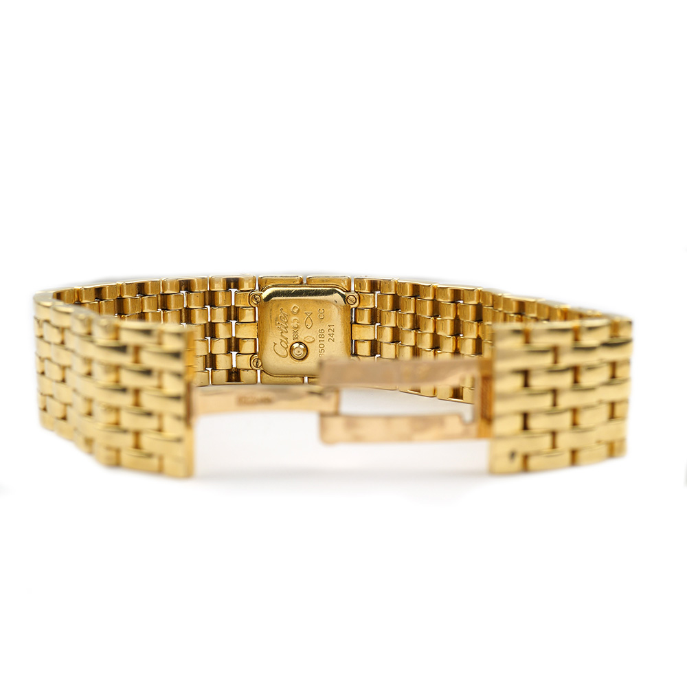 Cartier Ruban Lady, in oro giallo 18kt anni 2000 peso 96.3 gr. cassa carré circondata da diamanti taglio brillante ct 0,40 circa, n. 850186, quadrante in madreperla con numeri romani, vetro zaffiro, ref. 2421, movimento al quarzo, bracciale originale maglia panthere in oro giallo 18kt con chiusura deployante a scomparsa (chiavetta mancante). Completo di scatola