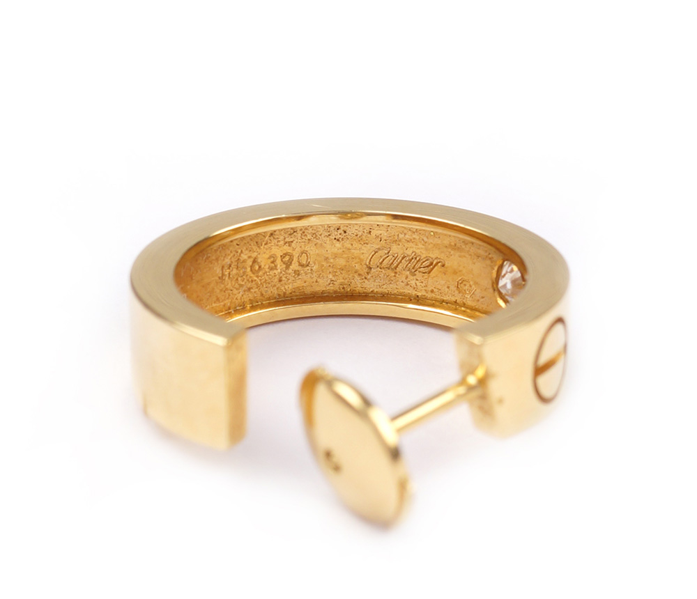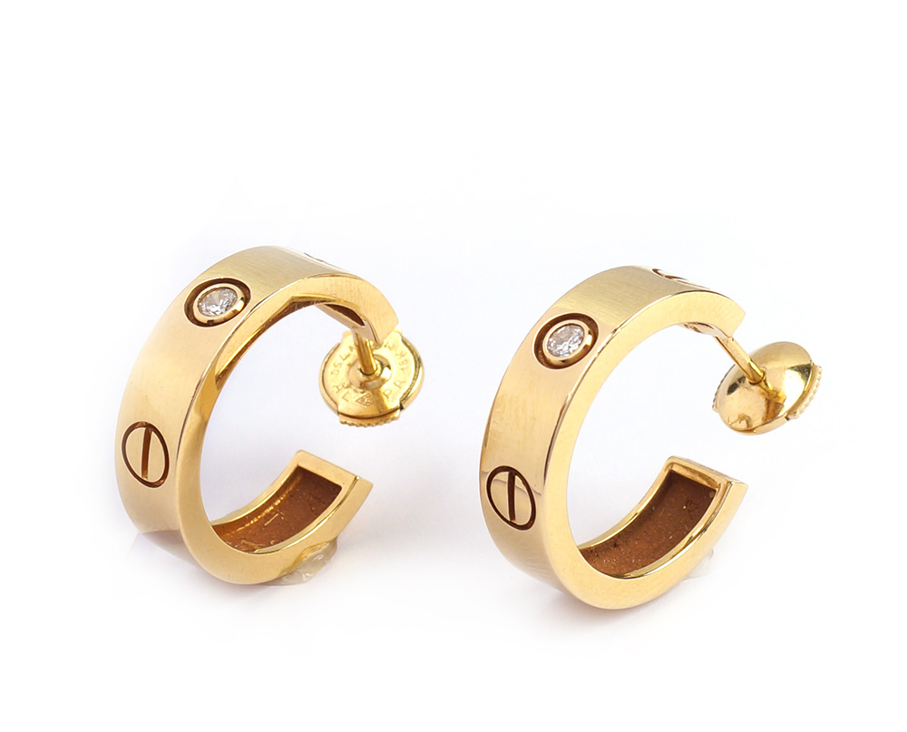 Cartier "Love", orecchini in oro giallo 18kt firmato e numerato H56390 peso 13 gr. e diamanti taglio brillante ct 0,15 circa. Completi di scatola