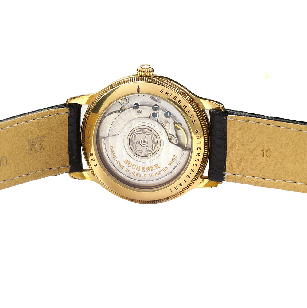 Bucherer Automatic, orologio da polso laminato oro, cassa tonda mm. 34, ref. 2892.503, quadrante dorato datario ore 3, vetro zaffiro, movimento scheletrico a carica automatica, calibro Y3, cinturino in pelle con fibbia in metallo dorato