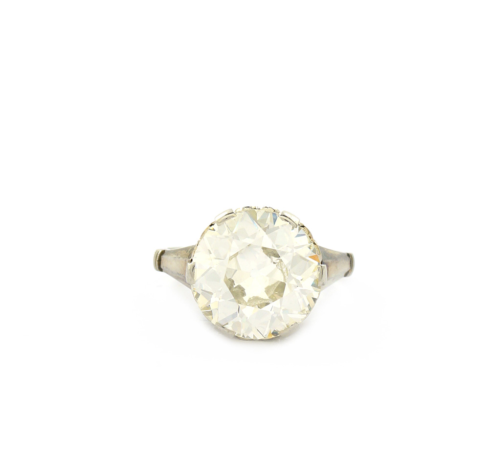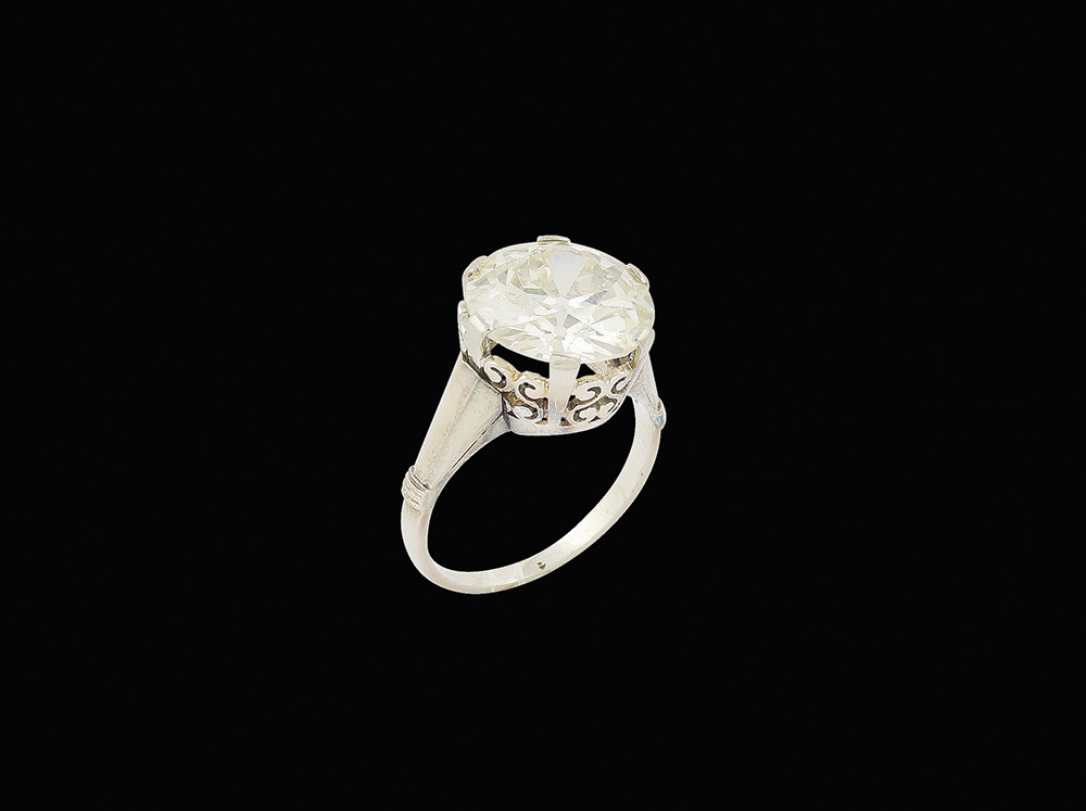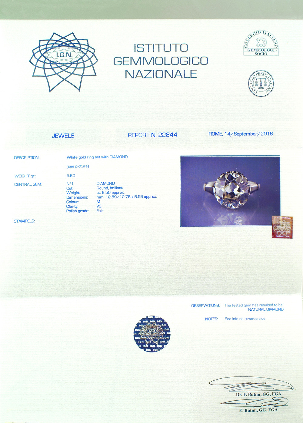 taglio brillante antico ct 6,50 circa, colore M - purezza VS, misura 15,5. Completo di certificato gemmologico I.G.N