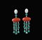 Orecchini pendenti in oro bianco e giallo 18kt peso 14,9 gr. con smeraldi taglio ovale e a goccia ct 10,50 circa, alternati a diamanti taglio brillante ct 3,30 circa e due sezioni di corallo rosso Sardegna taglio cabochon