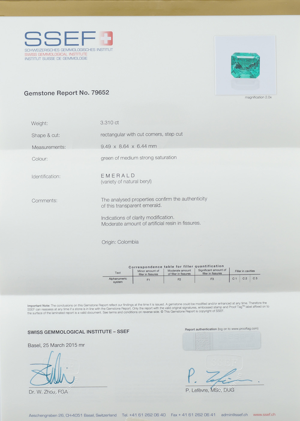 Anello in oro bianco 18kt e smeraldo ct 3,31 peso 12,8 gr. origine Colombia, contornato da diamanti taglio brillante ct 2,10 circa. Completo di certificato gemmologico SSEF n. 79652