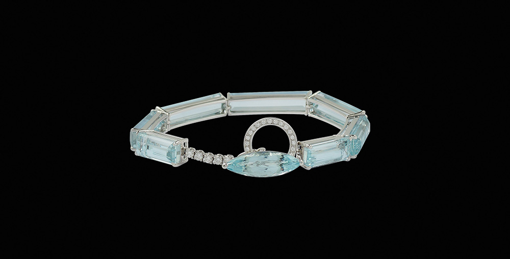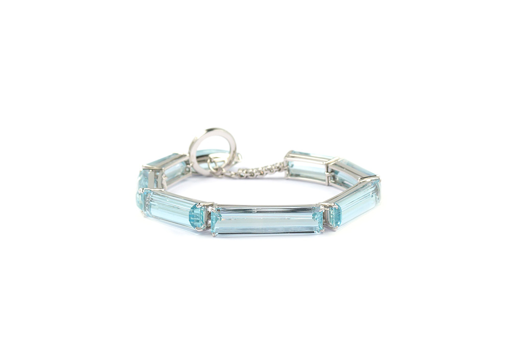 Bracciale semirigido in oro bianco 18kt peso 24,7 gr. con sette acquamarine taglio baguettes, chiusura in oro bianco e diamanti taglio brillante ct 0,50 circa con acquamrina taglio marquise, diametro cm. 7