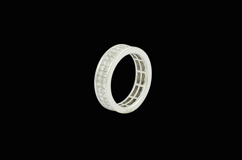 Anello fede in oro bianco 18kt e diamanti peso 5,5 gr. taglio princess incastonati a doppio binario invisibile, misura 14