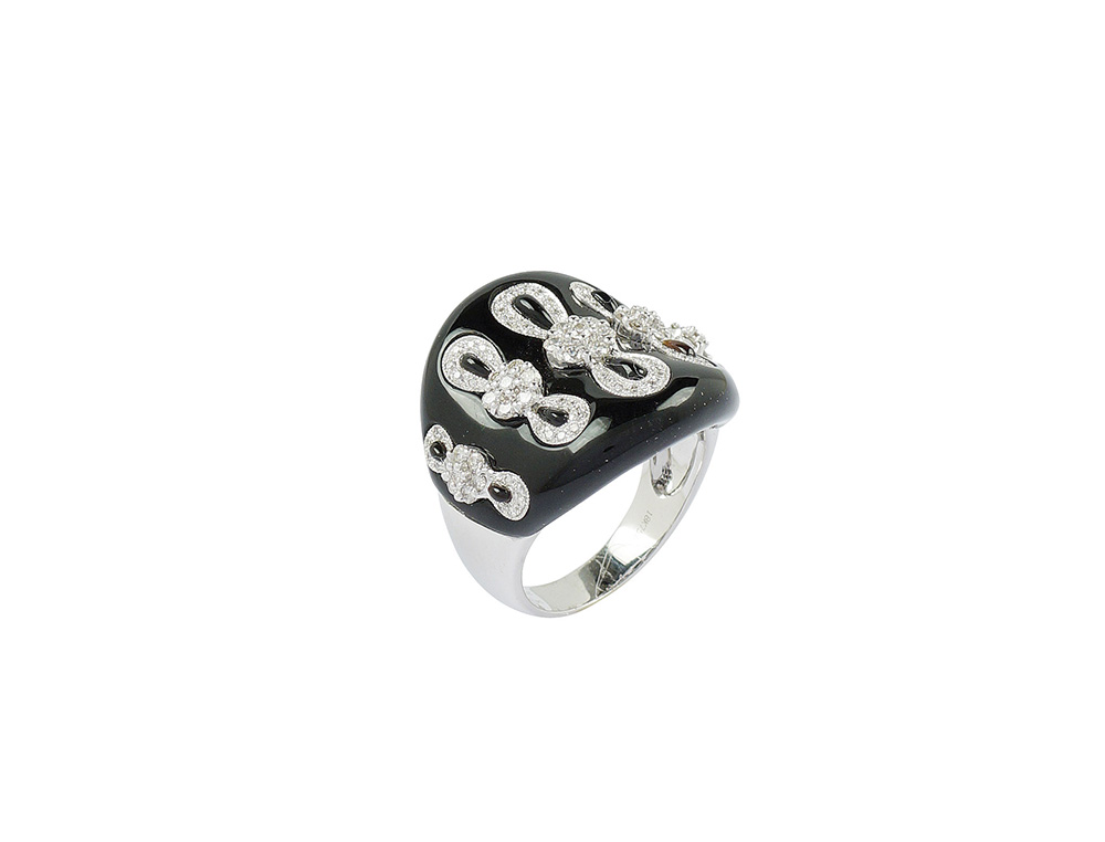 Anello in oro bianco 18kt onice e diamanti peso 13,2 gr. taglio brillante ct 0,85 circa disposti a motivo floreale, misura 17