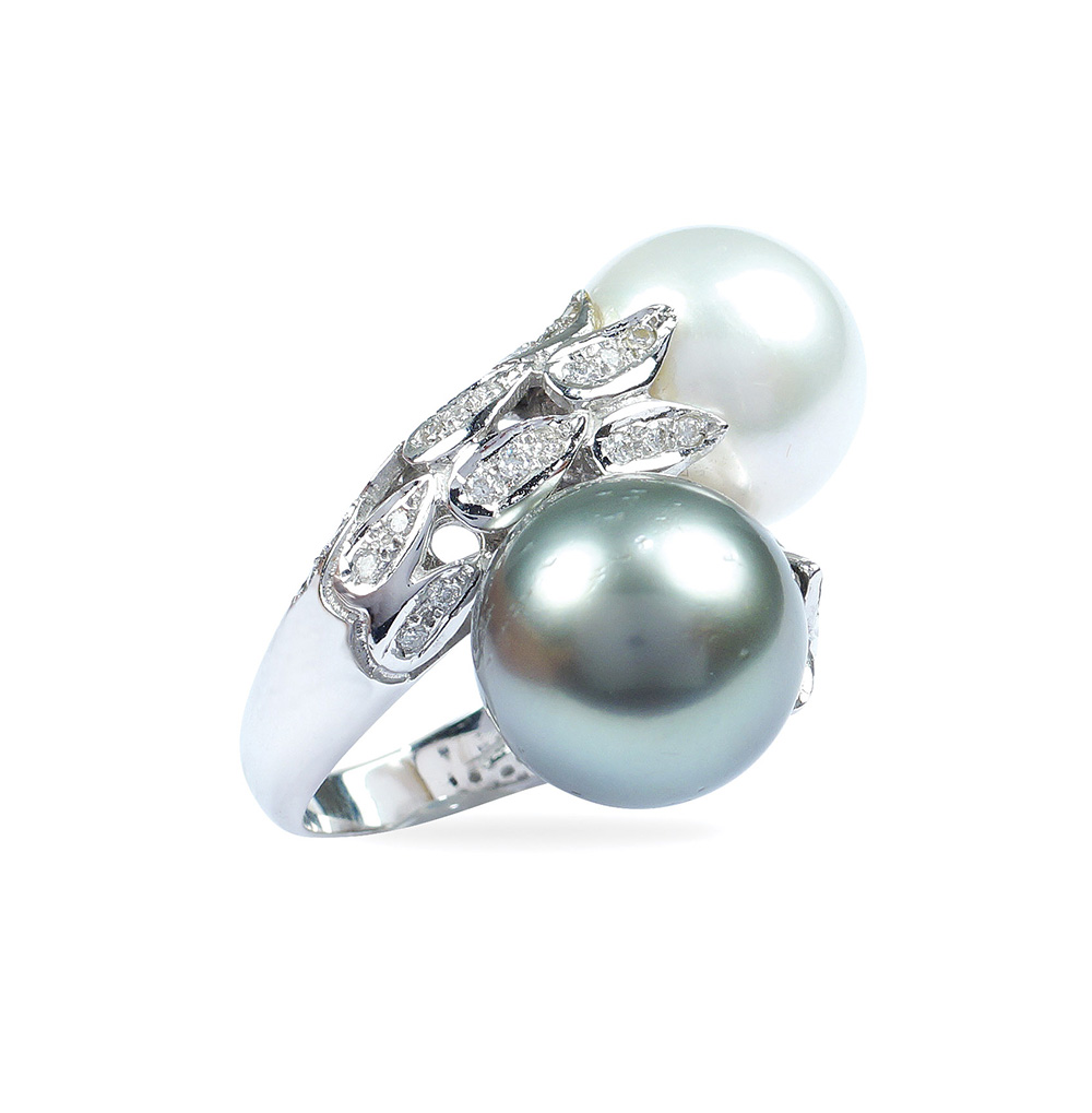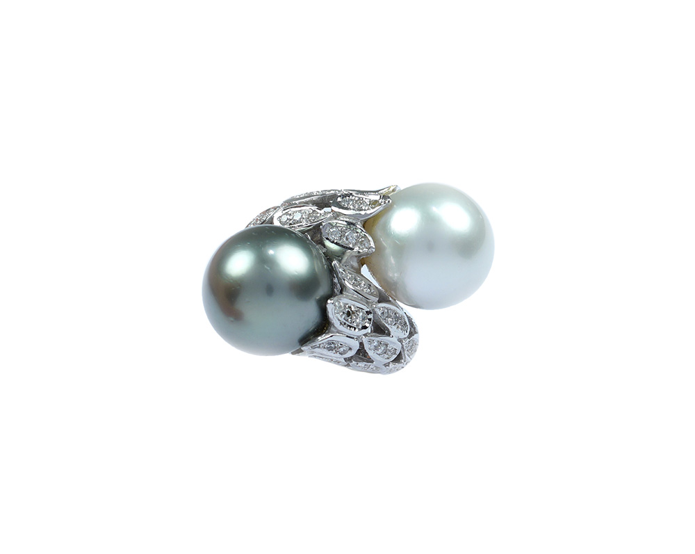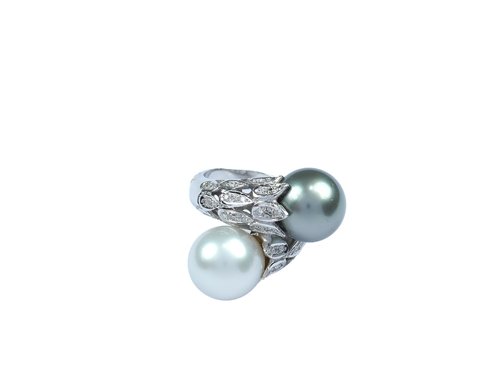 Anello contrarie in oro bianco 18kt peso 19 gr. con una perla South Sea mm. 9 circa e una perla Tahiti mm. 9 circa e diamanti taglio brillante ct 0,60 circa, misura 15,5