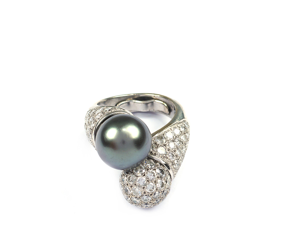 Anello contrarie in oro bianco 18kt peso 19,9 gr. con una perla Tahiti di mm. 10 e sfera di diamanti taglio brillante ct 3 circa, misura 13