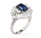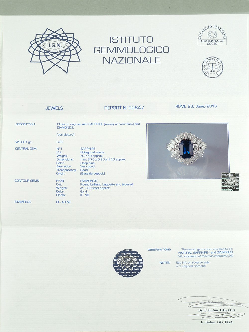 Anello in platino con zaffiro naturale peso 6,9 gr. origine Basaltica (Thailandia), taglio ottagonale a gradini ct 2,50 circa e diamanti taglio brillante baguette e tapered ct 1,80 circa, colore G/H, purezza IF-VS, (no trattamento termico), misura 14. Completo di certificato gemmologico I.G.N. n. 22647