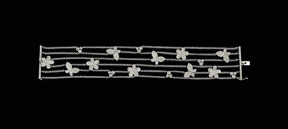 Bracciale in oro bianco 18kt e diamanti firmato Crivelli peso 23,5 gr. composto da sei catenine in oro bianco riunite da elementi a foggia di fiori e farfalle con diamanti taglio brillante ct 3,60 circa, lunghezza cm 17,5