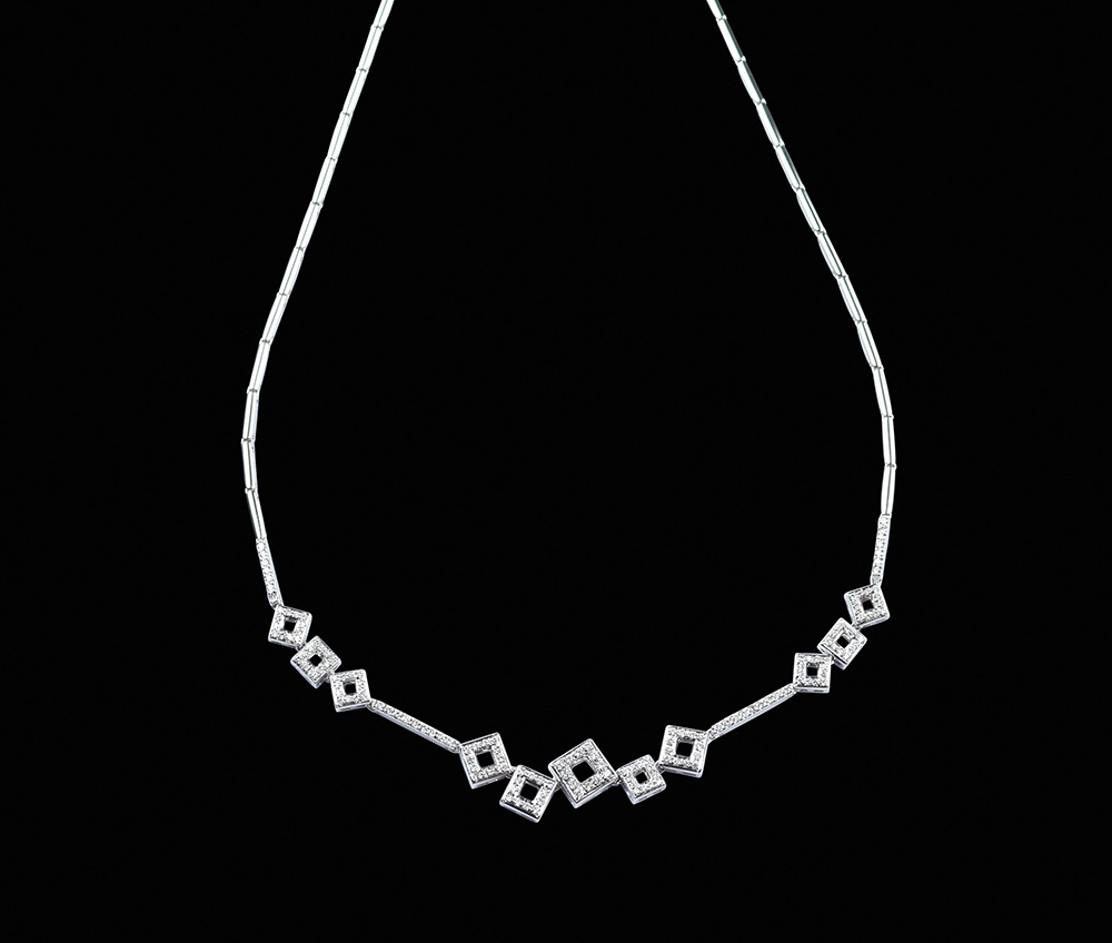 Girocollo in oro bianco 18kt peso 19 gr. a motivo geometrico con diamanti taglio brillante ct 0,90 circa, lunghezza 42 cm.