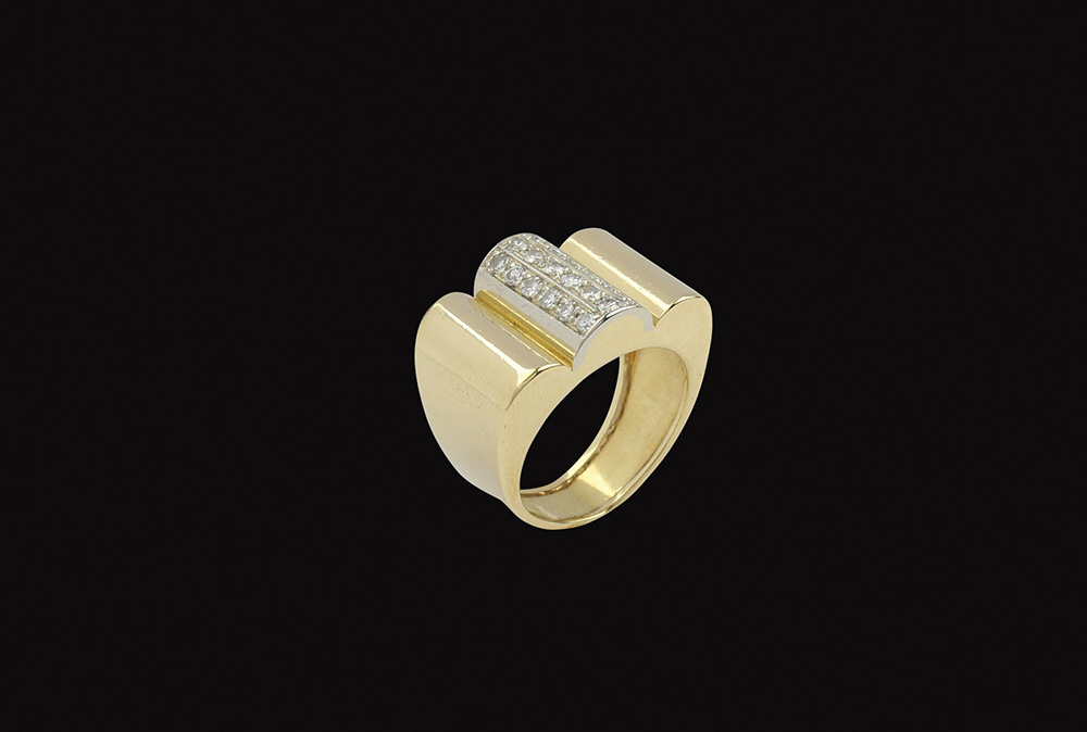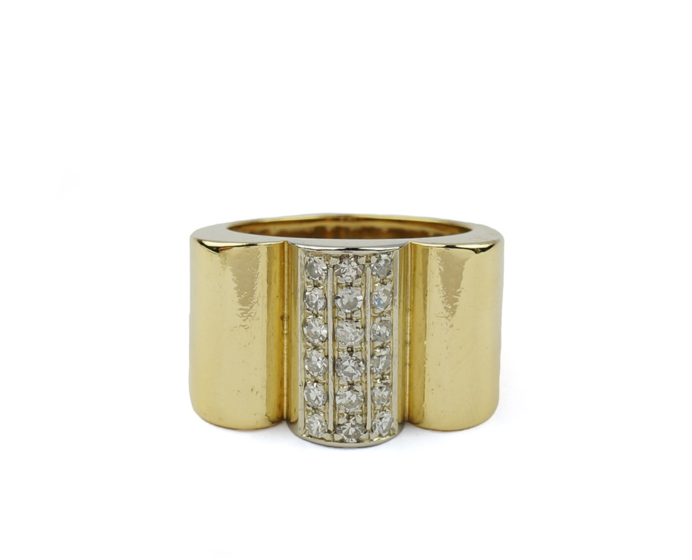 Anello a ponte in oro giallo 18kt peso 12,4 gr. con diamanti taglio brillante ct 0,40 circa, misura 16